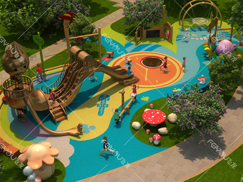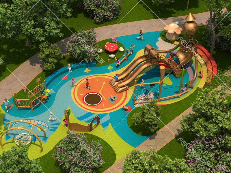 本設(shè)計(jì)以“銅人”造型滑梯為中心,輔以鳥(niǎo)巢秋千、蘑菇小屋、告示牌等造型玩具,培養(yǎng)幼兒鉆、爬、滑、晃等能力,為幼兒提供全方位的游戲體驗(yàn)