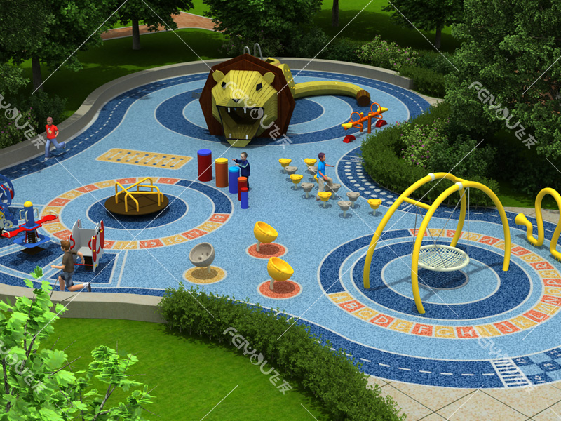 本設計以“獅子”造型為中心,輔以鳥巢秋千、傳聲筒、打擊樂器、拍鼓、搖搖樂、蹺蹺板等造型玩具,鍛煉兒童四肢的平衡發展,培養幼兒鉆、爬、滑、搖、拍、聽、音等能力。
